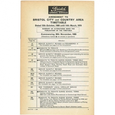 Contains separate leaflet of alterations issued after publication of the timetable "Amendment to Bristol city and country area timetable", (mb C7089 issued 11/69) & addendum of alterations to the amendment (mb C8794 issued 2/70)