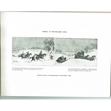 Fold-out double centre-page illustration of carriages, "Travelling on the Liverpool and Manchester Railway"