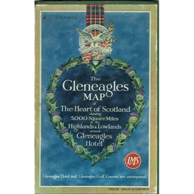 Extremely decorative map, with striking detail, showing Gleneagles & golf courses and hotel at the centre of a map, presented in an oval with decorative border and logo of the London Midland & Scottish Railway Company and Gleneagles at the corners. Small pictographs depict many buildings (from Balmoral Castle in the north to Peebles hotel and hydro in the south), bridges and shipping. Small inset map at right of the LM&S system within a decorative thistle border. Scale of the main map is 10 miles to 2.5 inches. Text at lower left of the map reads "constructed and printed by W. & A.K. Johnston, Ltd., Edinburgh"; at lower right: "McCorquodale & Co., Ltd., Glasgow".