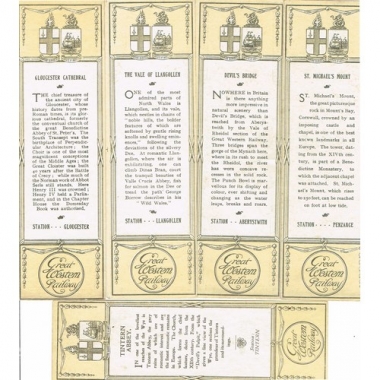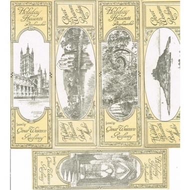 5 bookmarkers: Tintern Abbey (station Tintern); St. Michael's Mount (station Penzance); Gloucester cathedral (station Gloucester); Devil's bridge (station Aberystwith [sic]); Vale of Llangollen (station Llangollen)