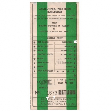 Railway Ticket, USA, California Western Railroad, Northspur - Fort Bragg, Serial No 1673