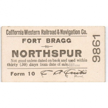 Railway Ticket, USA, California Western Railroad and Navigation Co, Fort Bragg - Northspur, Serial No 9861