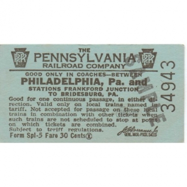 Railway Ticket, USA, Pennsylvania Railroad Co, Philadelphia - Bridesburg, Serial No 34943