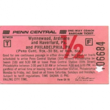 Railway Ticket, USA, Penn Central, Wynnewood - Philadelphia, Serial No 06684