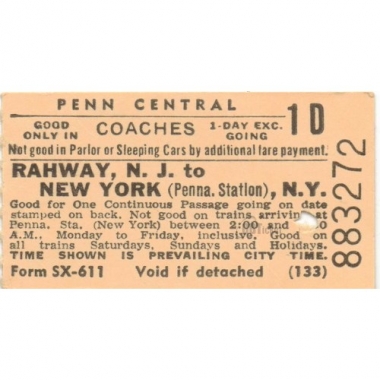 Railway Ticket, USA, Penn Central, Rahway - New York, 1 Day Exc, Serial No 883272
