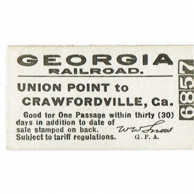 Travel Ticket, USA, Georgia Railroad, Union Point - Crawfordville, Serial No 6857