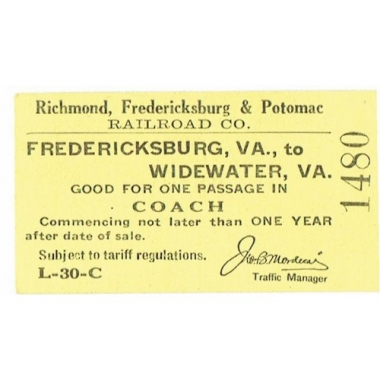 Travel Ticket, USA, Richmond, Fredericksburg & Potomac Railroad, Fredericksburg - Widewater, Serial No 1480