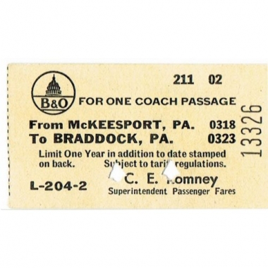 Travel Ticket, USA, Baltimore and Ohio Railroad, McKeesport - Braddock, Serial No 13326