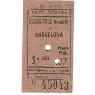 Railway Ticket, Spain, Renfe, Sabadell - Barcelona, Serial No U 45043