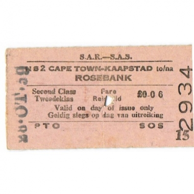 Railway Ticket, South Africa, SAR, Cape Town - Rosebank, Serial No 2934