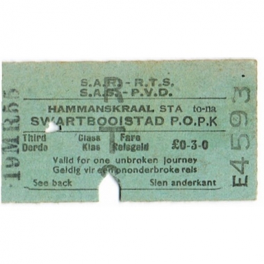 Railway Ticket, South Africa, SAR, Hammanskraal - Swartbooistad, Serial No E4593