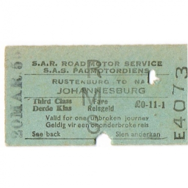 Railway Ticket, South Africa, SAR, Rustenburg - Johannesburg, Serial No E4073