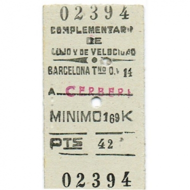Railway Ticket, Spain, Renfe, Barcelona, Complementary, Serial No 02394