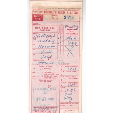Railway Ticket, USA, The Delaware & Hudson Railroad, Plattsburgh - Harmon, Serial No 2512