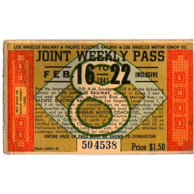Travel Ticket, USA, Los Angeles Railway, Pacific Electric Railway & Los Angeles Motor Coach, Joint Weekly Pass, Serial No 2245