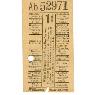 Bus Ticket, Widnes Corp Motor Bus, 1d, Serial No 52971