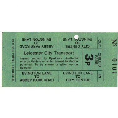 Bus Tickets, Leicester City Transport,Commemoration Ticket, City Centre - Evington Lane, Childs Fare 3p, Serial No 0101