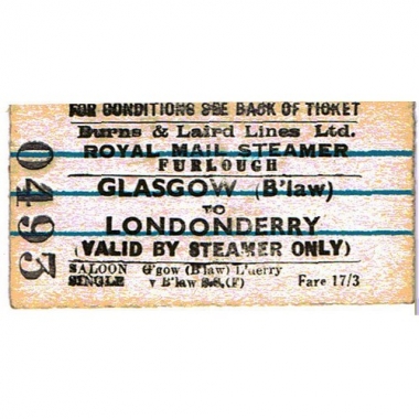 Water Ticket, Burns & Laird Lines, Royal Mail Steamer, Glasgow - Londonderry, Serial No 0493