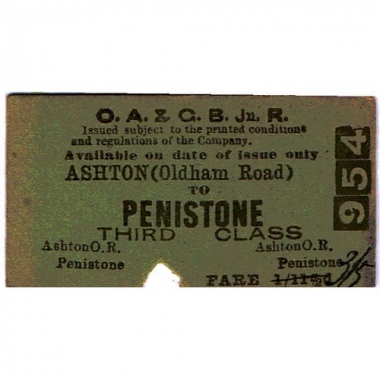 Travel Ticket, OA&GB, Ashton (Oldham Road) - Penistone, Serial No 954