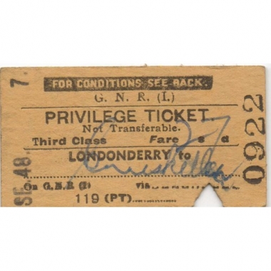 Railway Ticket, Northern Ireland, GNR(I), Londonderry - Enniskillen, Privilege Ticket, Serial No 0922
