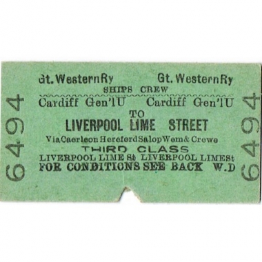 Travel Ticket, GWR, Cardiff General - Liverpool Lime Street, Ships Crew, Serial No 6494