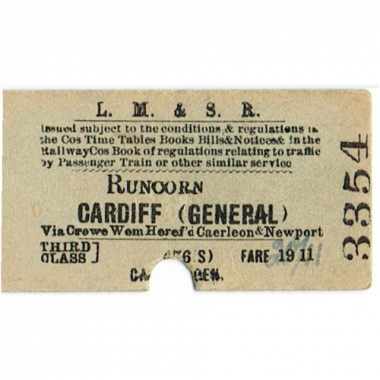 Travel Ticket, LM & SR, Runcorn - Cardiff (General), Serial No 3354