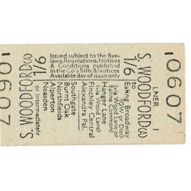 Travel Ticket, LNER, South Woodford - Ealing Broadway, Serial No 0607