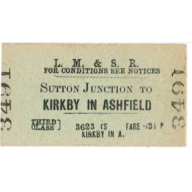 Travel Ticket, LM&SR, Sutton Junction - Kirkby in Ashfield, Serial No 3491