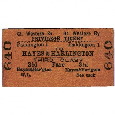 Travel Ticket, GWR, Paddington - Hayes & Harlington, Serial no 640