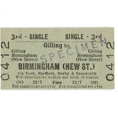 Travel Ticket, BTC(N), Gilling - Birmingham (New St.), Serial No 0412