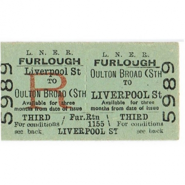 Travel Ticket, LNER, Oulton Broad (Sth) - Liverpool Street, Forces on Leave, Serial No 5989