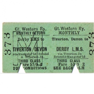 Travel Ticket, GWR, Tiverton - Derby LMS, Serial No 373