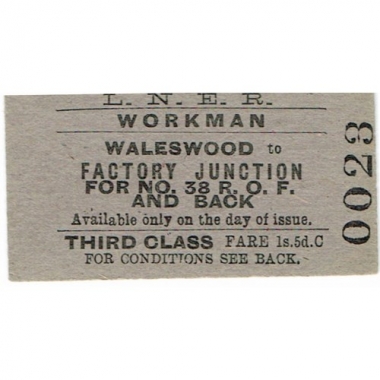 Travel Ticket, LNER, Workman, Waleswood - Factory Junction, For No. 38 R.O.F. and back, Serial No 0023