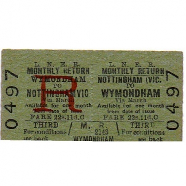 Travel Ticket, LNER, Nottingham (Vic.) - Wymondham, Serial No 0497