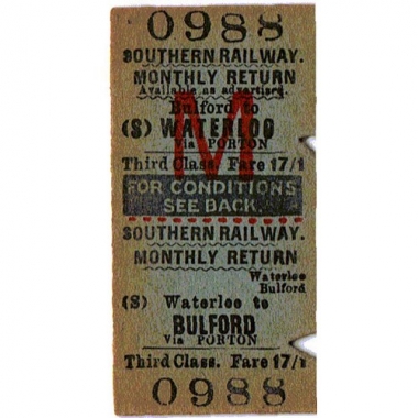 Travel Ticket, SR, Waterloo - Bulford, Serial No 0988