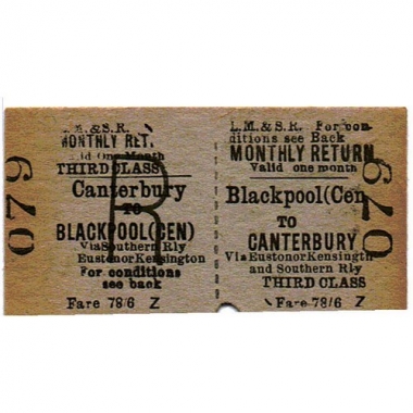 Travel Ticket, LM&SR, Blackpool (Central) - Canterbury, Serial no 079