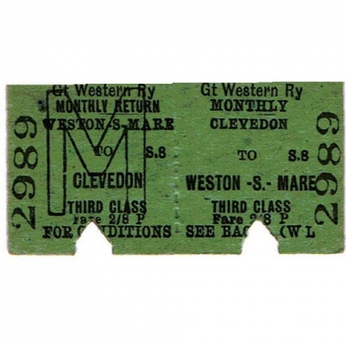 Travel Ticket, GWR, Monthly Return, Clevedon - Weston-S-Mare, Serial no 2989