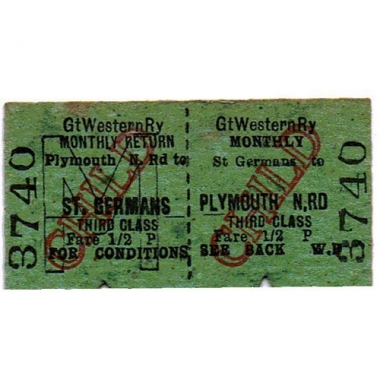 Travel Ticket, GWR, St Germans - Plymouth North Road, Serial No 3740