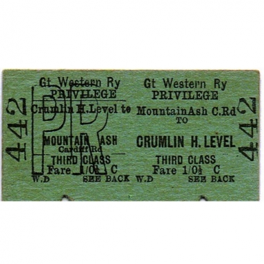 Travel Ticket, GWR, Mountain Ash Cardiff Rd - Crumlin H.Level, Serial no 442