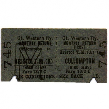 Travel Ticket, GWR, Bristol TM - Cullompton, Serial no 745