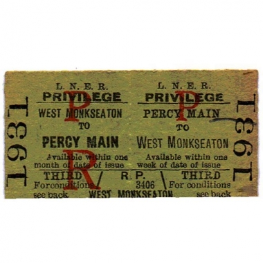 Travel Ticket, LNER, Privilege, Percy Main - West Monkseaton, Serial no 1931