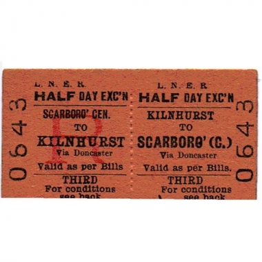Travel Ticket, LNER, Half Day Excursion, Kilnhurst - Scarborough Central, Serial no 0643