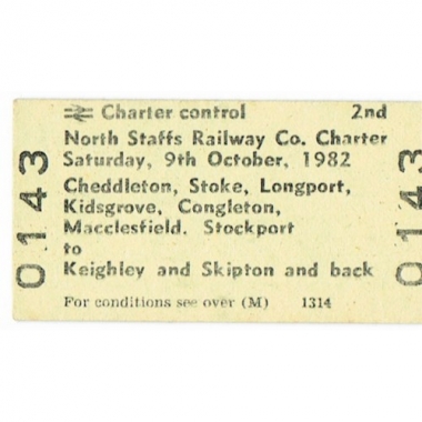 Travel Ticket, BRB (M), North Staffs Railway Co Charter, Cheddleton to Keighley, Serial No 0143