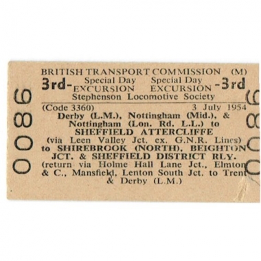 Travel Ticket, BTC(M), Stephenson Locomotive Society Special Day Excursion, Derby (L.M.) - Shirebrook (North), Serial No 0086